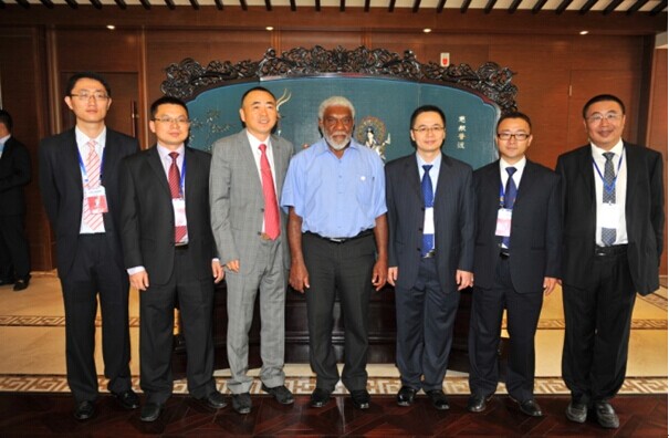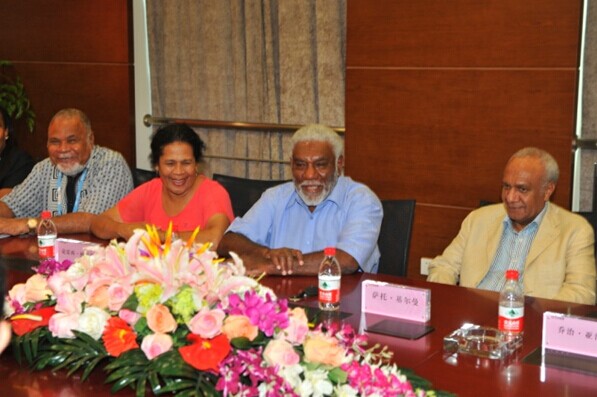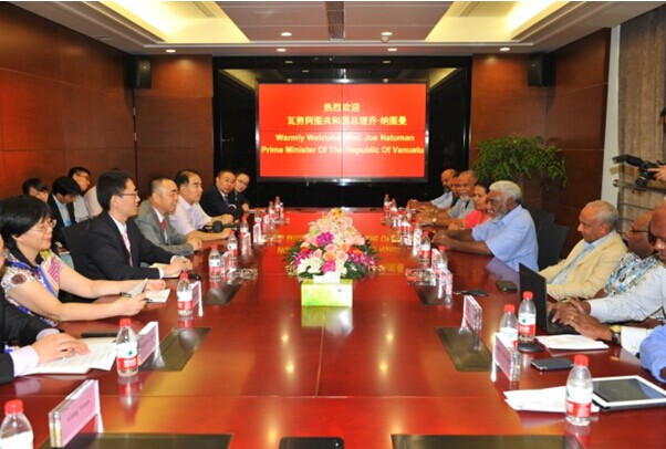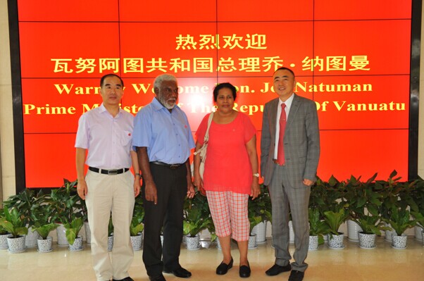 8月15日上午,正在中國南京出席第二屆青奧會開幕式的瓦努阿圖共和國總理喬·納圖曼在瓦外交部長薩托·基爾曼、瓦駐中國大使莫利薩夫婦和中國駐瓦大使謝波華夫婦等陪同下,率領政府代表團一行10余人來集團公司考察訪問。陳正華董事長熱情接待了代表團一行。